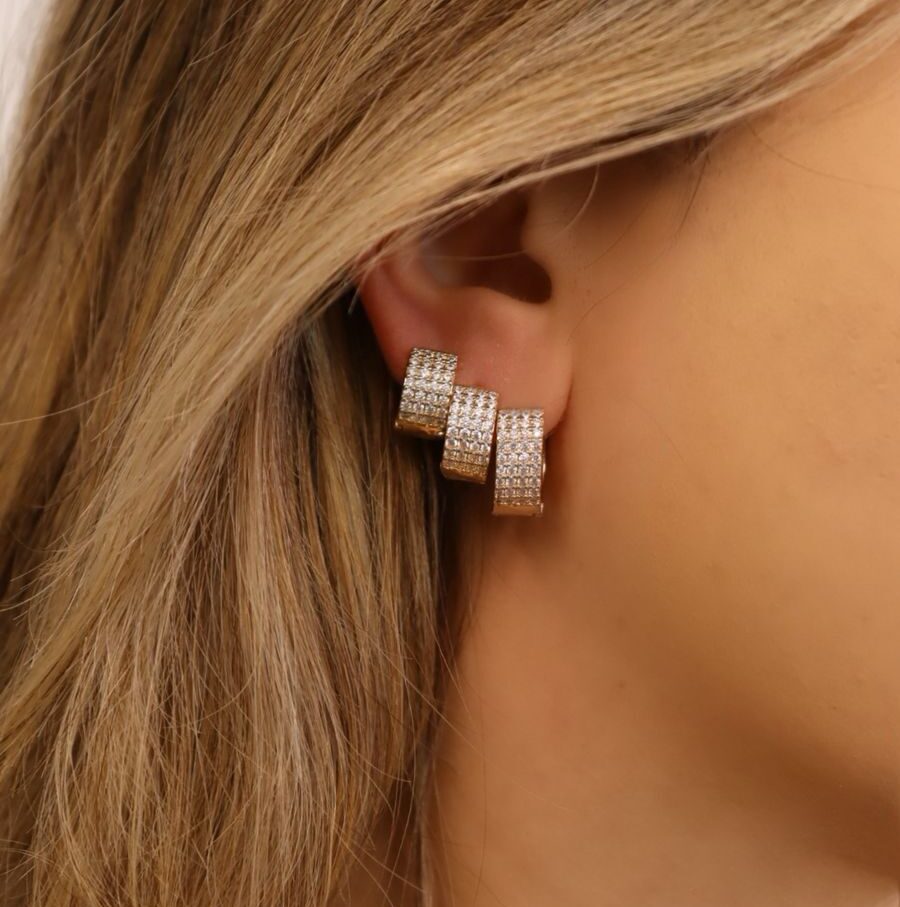 Cravejado com zircônias, em suas quatro fileiras, este brinco é a escolha perfeita para quem deseja um toque de sofisticação e glamour para o look.