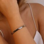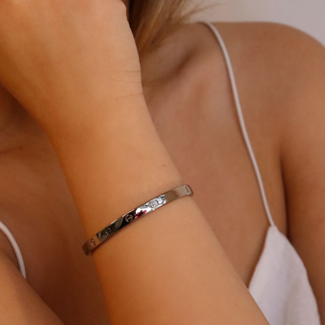 Bracelete sofisticado em metal prateado, com um design minimalista e moderno. O modelo rígido apresenta detalhes em relevo que remetem a pequenos parafusos, conferindo um toque industrial e contemporâneo à peça.