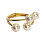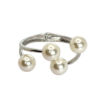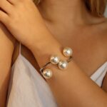 Os braceletes são elegantes e sofisticados, apresentando um design aberto com um acabamento metálico refinado. Um deles tem um tom dourado e o outro prateado, ambos adornados com pérolas em diferentes tamanhos. As pérolas estão estrategicamente posicionadas ao longo da estrutura do bracelete, criando um efeito moderno e harmonioso. O design minimalista, mas luxuoso, torna essas peças versáteis, ideais para complementar looks clássicos ou contemporâneos.