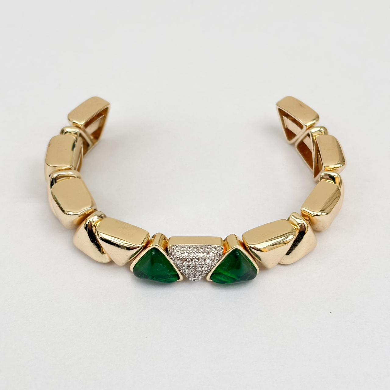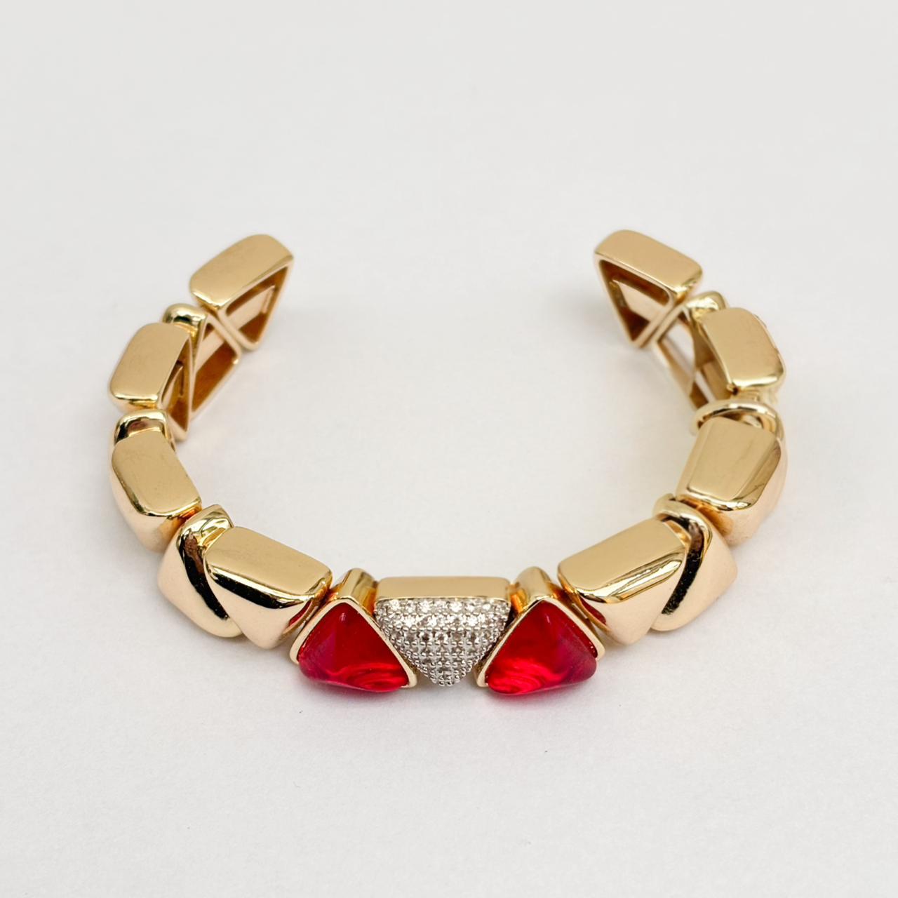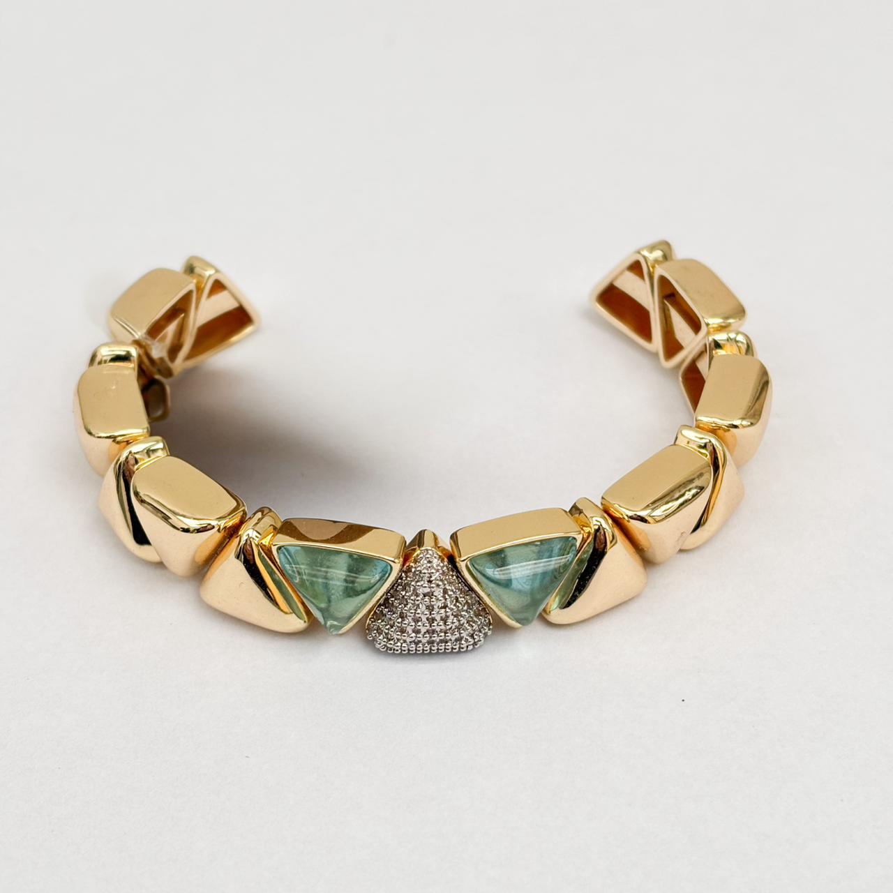Esse bracelete é um verdadeiro destaque para quem ama acessórios com presença marcante e visual sofisticado. Com estrutura rígida e acabamento dourado polido, ela é composta por elos em formato triangular que alternam entre cristais de cor vibrante, placas metálicas e uma peça central cravejada com microzircônias brilhantes, criando uma composição rica em texturas e contrastes.