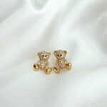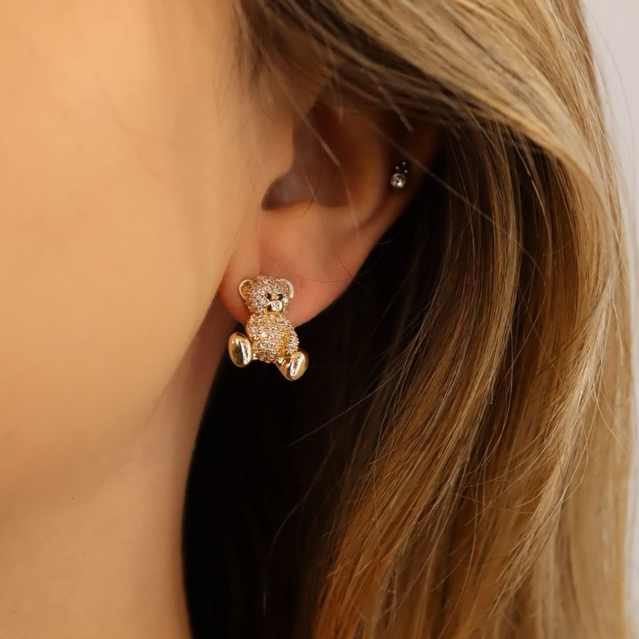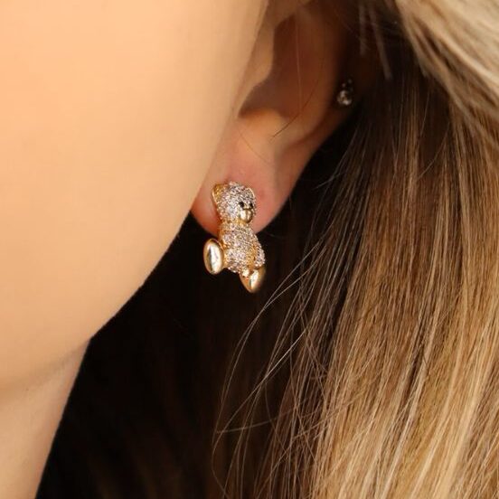 Com formato de um ursinho fofo e sofisticado, a peça é toda cravejada com pedras brilhantes que adicionam um charme extra. O design, cuidadosamente elaborado, mistura o estilo lúdico com o luxo das pedras cravejadas, tornando o brinco um acessório divertido e cheio de personalidade.